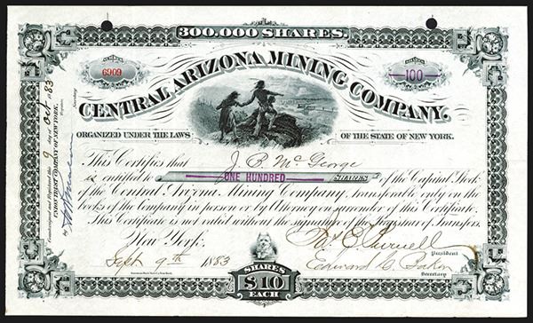 Arizona. 100 Shares, I/U stock certificate, Black with Native Americans overlooking Progress, VF. ABNC.