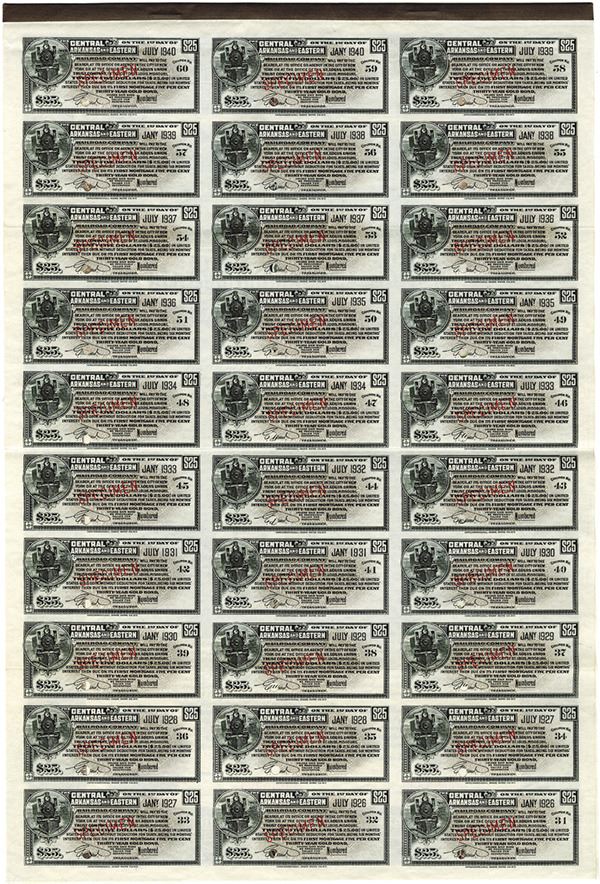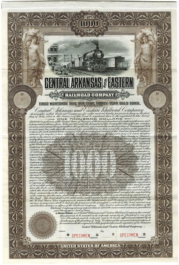Arkansas. $1000 Specimen 5% First Mortgage Gold Coupon Bond. Black print with a very ornate brown/black border and under print. Vignette of a locomotive leaving station with the railyard behind it. Beside the locomotive are two allegorical male figures leaning up on pillars. Specimen overprints, POC's, XF condition with all coupons attached. IBNC.