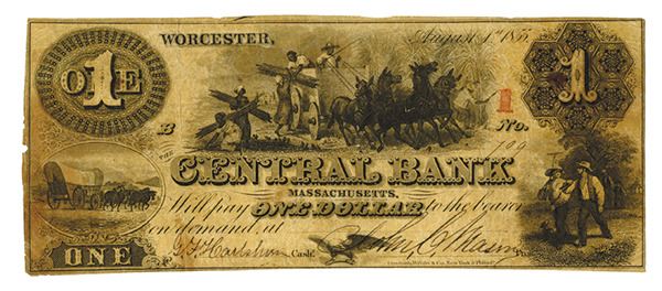 Worcester, MA. 1855, $1, MA-1305-A5, Issued, Altered from Central Bank of Tennessee, S/N 709, Choice Fine to VF. DW&C.