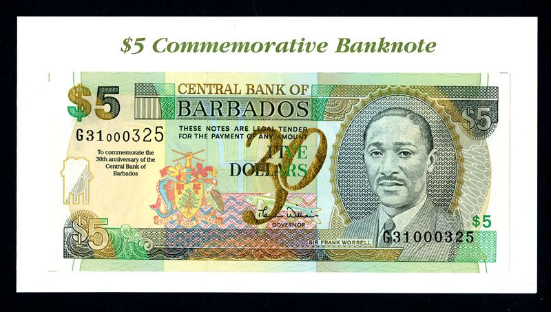 Barbados. 5 Dollars. P-65A. Commemorative for the 30th Anniversary of the Central Bank. Note tiped into card folder. In TDLR plastic. This is the Pick Plate Note. Choice Uncirculated.