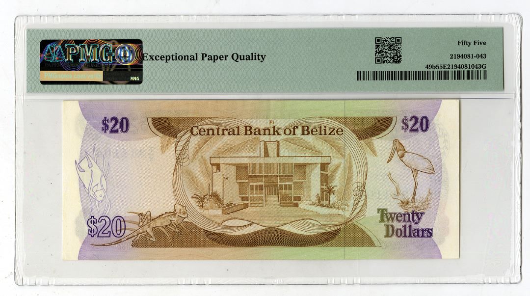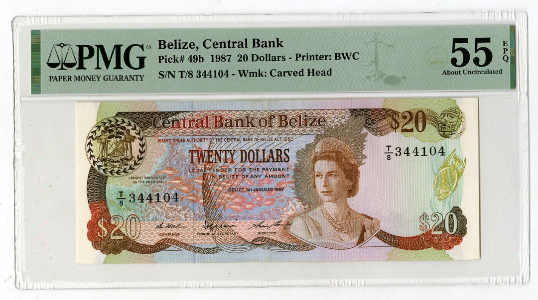 Belize, 1987. 20 Dollars, P-49b, Issued Banknote, Brown on m/c printing, Portrait of Queen Elizabeth II at right with school of fish at center and arms at left, Back is brown with green and purple, S/N T/8 344104, PMG graded About Uncirculated 55 EPQ, BWC.