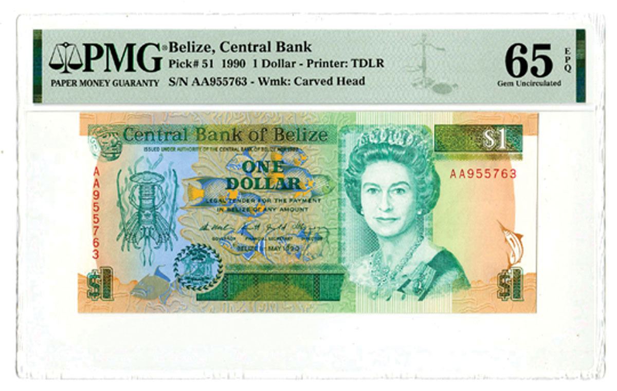 Belize, 1990. $1, P-51, Issued Banknote. Green on m/c underprint with portrait of Queen Elizabeth II at right. S/N AA955763 Printer: TDLR. PMG graded Gem Uncirculated 65 EPQ.