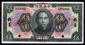 Mei Luk. 1923. $5. P-175c. Specimen banknote. Green and m/c front, back red. SYS in center. Specimen overprint, "00000" serial numbers and POC's. Uncirculated to CU. Never issued, specimen only note. ABNC. Rare banknote.