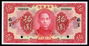 Mei Luk. 1923. $10. P-176Ac. Specimen banknote. Pink and m/c front, back orange. SYS in center. Specimen overprint, "00000" serial numbers and POC's. Uncirculated to CU. Never issued, specimen only note. ABNC. Rare banknote.