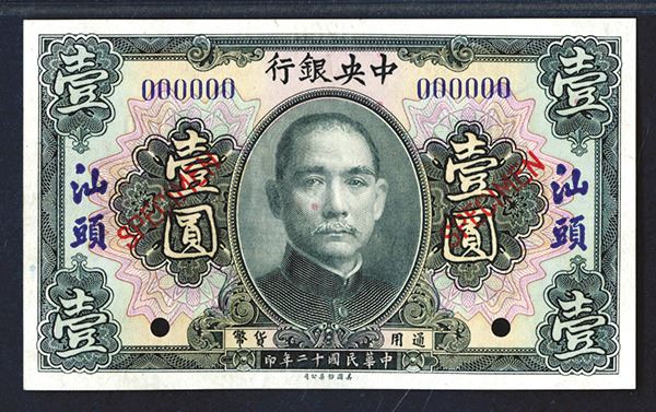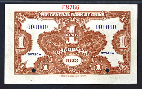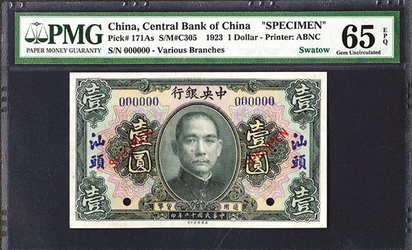 Swatow, China. 1923. $1. P-171Af. Specimen banknote. Dark green and m/c front, back brown. SYS in center. Specimen, "00000" serial numbers and POC's. PMG graded Gem Uncirculated 65 EPQ. Never issued, specimen only note. ABNC. This was one of 10 examples found in the 1991 Christies' American Bank Note Archives Auction which have long since been dispersed.