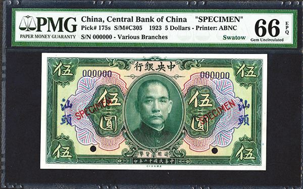 Swatow, China. 1923. $5. P-175f. Specimen banknote. Green and m/c front, back red. SYS in center. Specimen overprint, "00000" serial numbers and POC's. PMG graded Gem Uncirculated 66 EPQ. Never issued, specimen only note. ABNC. This was one of 10 examples found in the 1991 Christies' American Bank Note Archives Auction which have long since been dispersed.