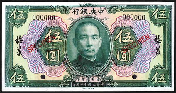 China, $5, P-175c, Green face, red back. Specimen banknote. Red specimen overprint, "00000" serial numbers and POC. Choice to Gem uncirculated condition. Never issued. ABNC. Extremely rare banknote.