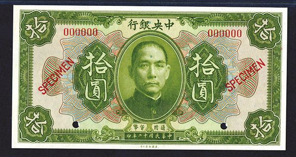 China. $10, P-177s (S/M#C305-14), Green face with SYS at center, blue back. Specimen banknote. Red specimen overprint, “00000” serial numbers and POC. PMG graded Superb Gem Uncirculated 68 EPQ, this note will be impossible to improve upon The finest known out of 15 graded in the PMG census. ABNC.