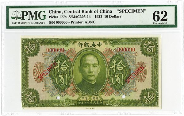 China. $10, P-177s, S/M#C305-14, Specimen, Green on m/c, back blue, Specimen overprints, POC's, "000000" serial numbers. PMG graded Uncirculated 62. ABN.