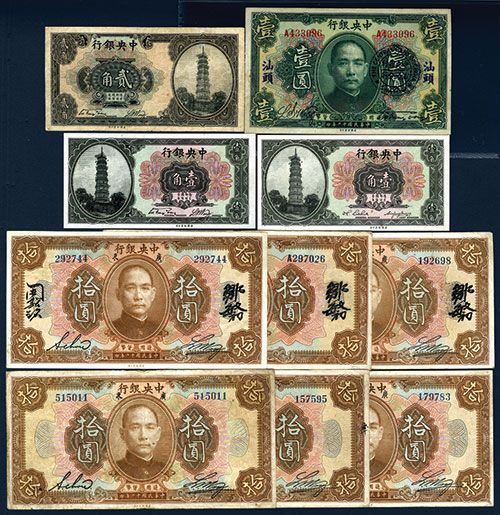 Lot of 9 notes, Includes 1923 issues, Swatow overprint, 41, P-171f, PMG graded Choice Very Fine 35; 2 examples of 10 Yuan, P-176a and one of P-176c, Fine to VF; 2 examples of 10 Yuan, P-176b, VF to XF; 10 Yuan, P-176e, VF; 1924 Issues, 10 Cents, P-193a and P-193b, AU to CU; 20 Cent, P-194a, Choice Fine to VF. All are ABNC. From The Allen Berk Collection.