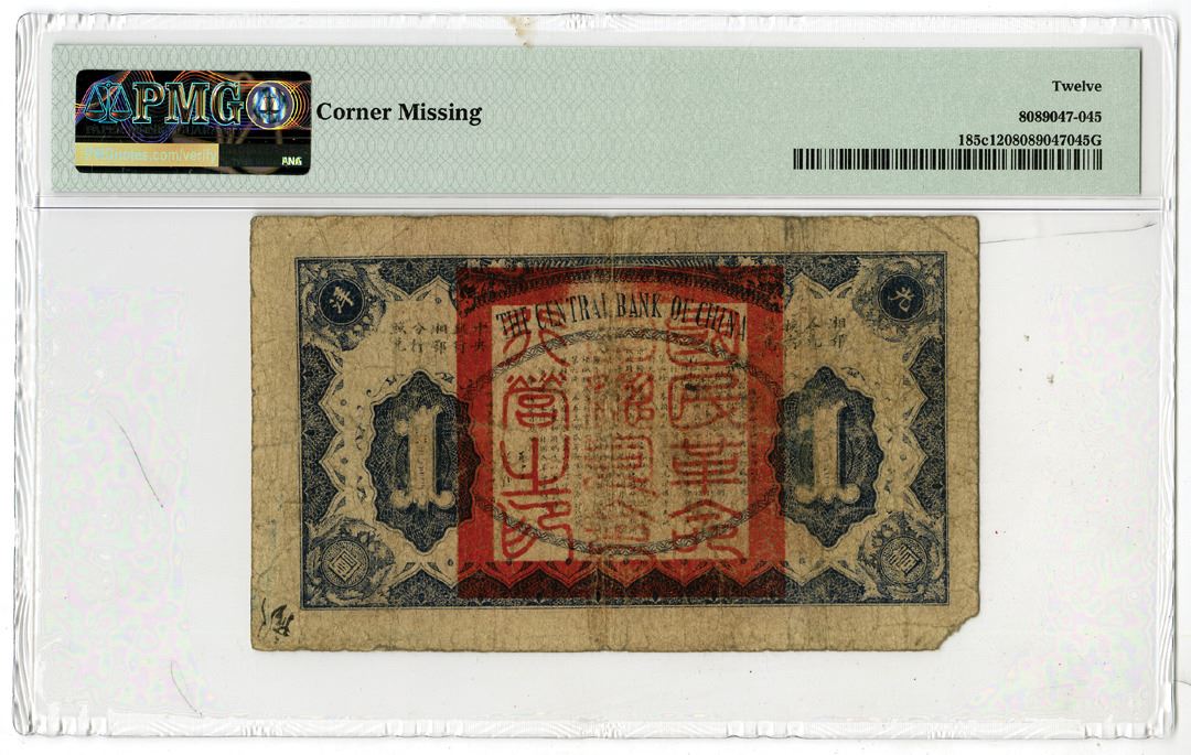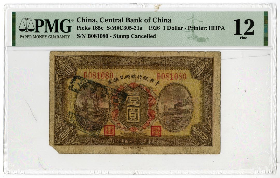 China. 1926. 1 Dollar, P-185c S/M#C305-21a, Issued banknote, Purple-brown on multicolor underprint, S/N B081080 - Stamp Cancelled, PMG graded Fine 12 with comment "Corner Missing." Printer: HHPA. Only 6 notes have been graded in the PMG census. This is the first time we have offered this variety in our auctions.