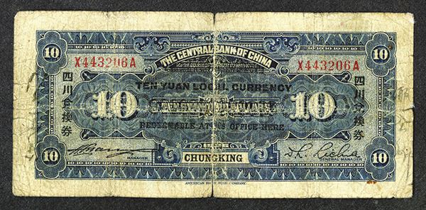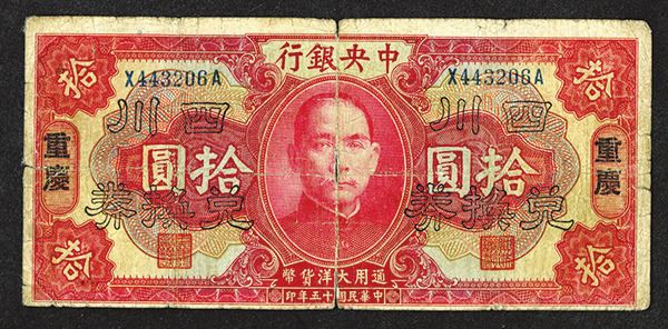 China, $10, P-184a, Issued banknote, red on m/c, SYS at center, back blue, VG to Choice VG with splits at folds, bright colors. ABNC.