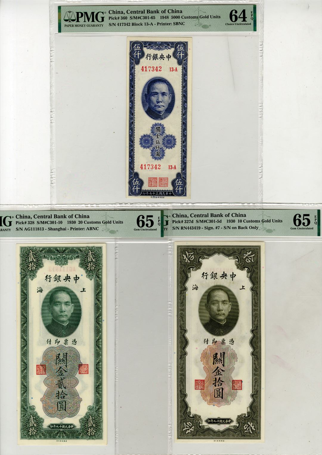 China, 1930-48. Lot of 3 Issued banknotes, Includes: 1930. 10 Customs Gold Units, P-327d S/M#C301-5d, Issued banknote, Dark brown on multicolor underprint, S/N RN443419, S/N on Back Only, Sign. #7, PMG graded Gem Uncirculated 65 EPQ; 1930. 20 Customs Gold Units, P-328 S/M#C301-10, Issued banknote, Green on multicolor underprint, S/N AG111813, PMG graded Gem Uncirculated 65 EPQ; and 1948. 5000 Customs Gold Units, P-360 S/M#C301-65, Issued Banknote. Blue print with SYS at center in vertical format. S/N 417342 Block 13-A. Printer: SBNC. PMG graded Choice Uncirculated 64 EPQ. (3)