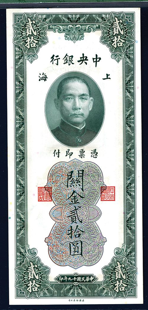 20 Gold Units, P-328 (S/M#C301-10), Issued banknote, Green on m/c underprint, SYS at top, back green, PMG graded Gem Uncirculated 66 EPQ (Exceptional Paper Quality), The Second highest graded in the PMG census out of 40. This is an opportunity to acquire a relatively common note in uncommon condition for the banknote connoisseur.