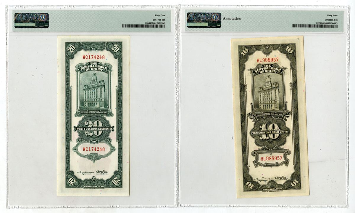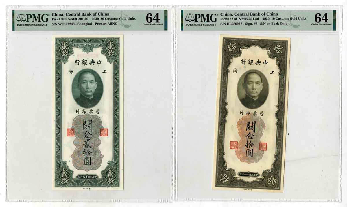 China, 1930. Lot of 2 Issued Banknotes, Includes: 10 CGU, P-327d S/M#C301-5d, S/N HL988957; and, 20 CGU, P-328, S/M#C301-10, Shanghai Branch, S/N WC174248. Both notes are PMG graded Choice Uncirculated 64 with the 10 CGU having a note "Annotation," Both printed by ABNC. (2). Sold "AS IS" no returns accepted.