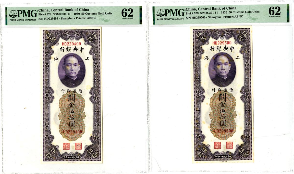 China, 1930. 2 Issued banknotes, both are 50 Customs Gold Units, P-329 S/M#C301-11, Purple on multicolor underprint, Sequential S/Ns are HD229499 and HD229500, and are PMG graded Uncirculated 62 with comment "Stains." Printer: ABNC.