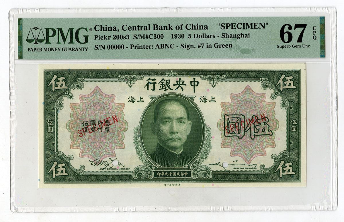 Shanghai, China, 1930. 5 Dollars, P-200s3 S/M#C300, Specimen Banknote, Green with m/c guilloche and SYS at center, Back is green with temple at center, Specimen overprints and POCs, S/N 00000, PMG graded Superb Gem Uncirculated 67 EPQ, ABNC. Tied as highest graded out of 16 graded in the PMG census.