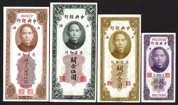 China. 10 Cents CGU, 1, 5, 250 Customs Gold Units. P-323b; 325; 326b; 331. S/M C301-1a; 3d; 4d; 13. SYS and Central Bank Building. Vertical format. Mostly About Uncirculated to Choice Uncirculated. 4 pieces.