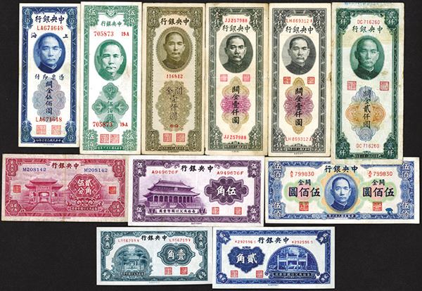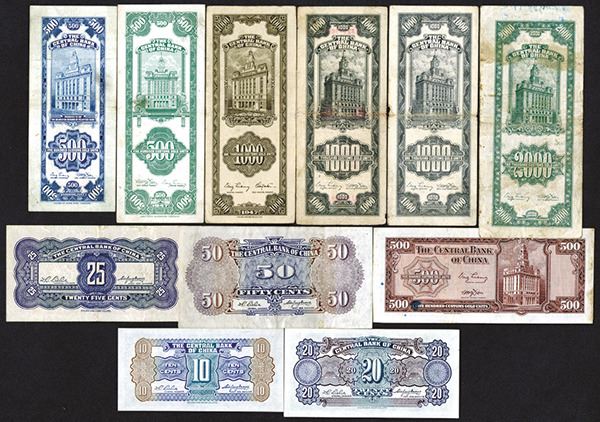 China. 10, 20, 25, 50 Cents. P-202; 203; 204; 205. VF to AU. 500, 1000, 2000 Custom Gold Units. P-334; 335; 336; 337; 338; 339b, c; 342a. VF but for the last which is Fin-VF with some stains.