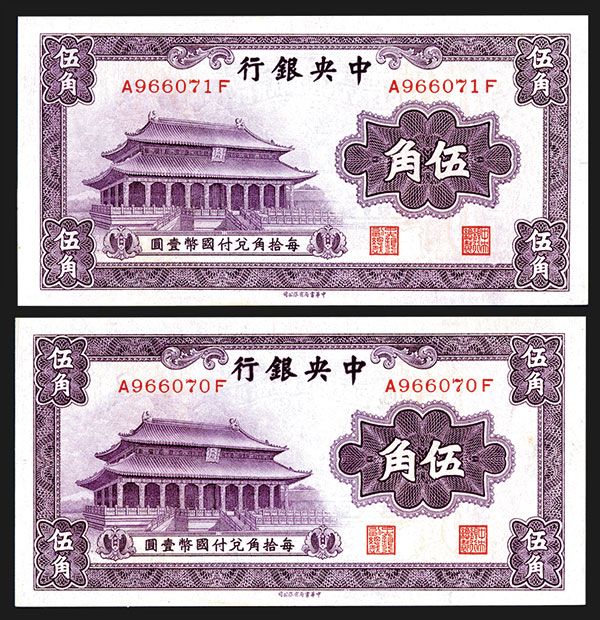 China, Lot of 2 notes, 50 cents, p-205, S/M#C300-24, Issued banknote pair, Purple with Temple of Confucius at left, back brown and blue, S/N A966070 F & A966071 F, Printer: CHB, attractive banknote pair.