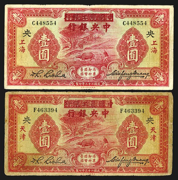 Lot of 2 notes, Includes $1, P-205Aa, Shanghai Branch, VF and $1, P-205Ab, Tientsin Branch, Fine to Fine+, Both are printed on Agricultural and Industrial Bank of China notes, P-A112. Scarce provisional notes.