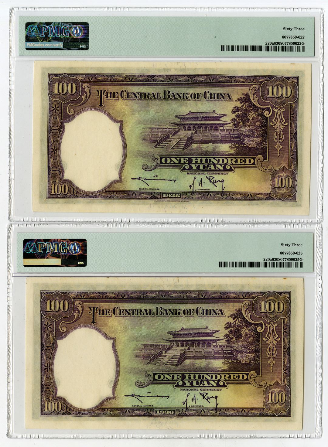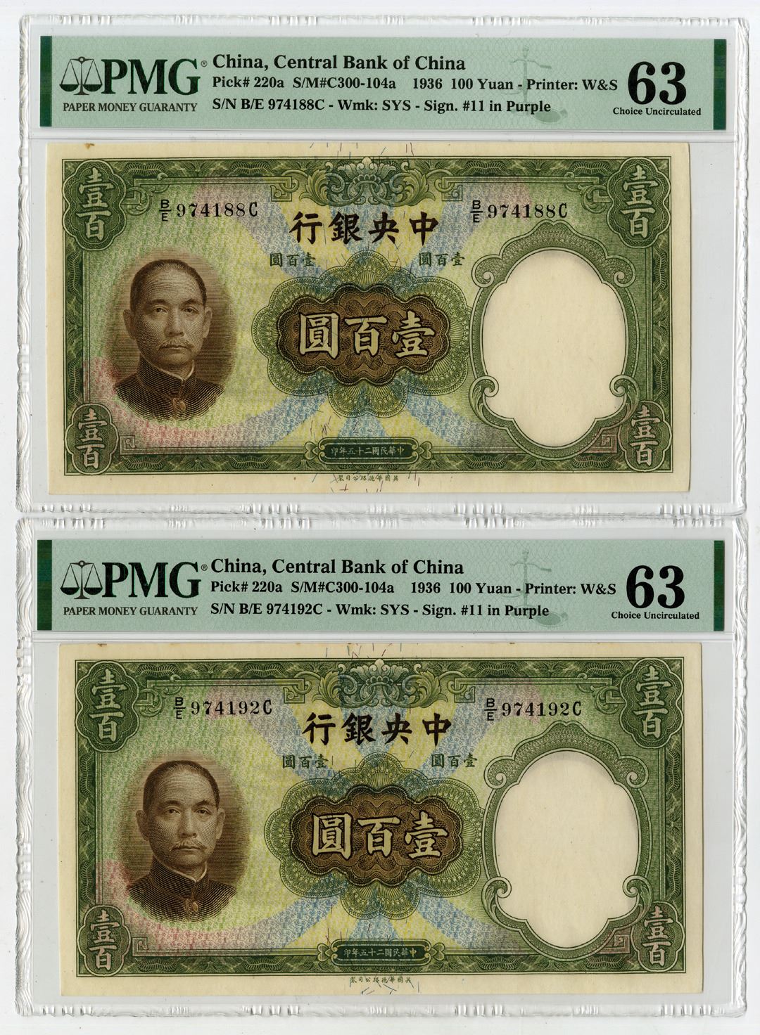 China, 1936. 100 Yuan, P-220a (2) S/M#C300-104a, Pair of Issued Banknotes, Green and brown on m/c underprint with SYS at left, Back is purple on m/c underprint, S/Ns B/E 974192C & B/E 974188C, Both notes are PMG graded Choice Uncirculated 63. W&S. (2). Sold "AS IS" no returns accepted.