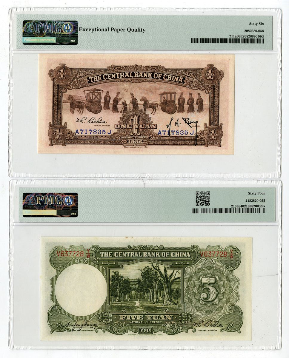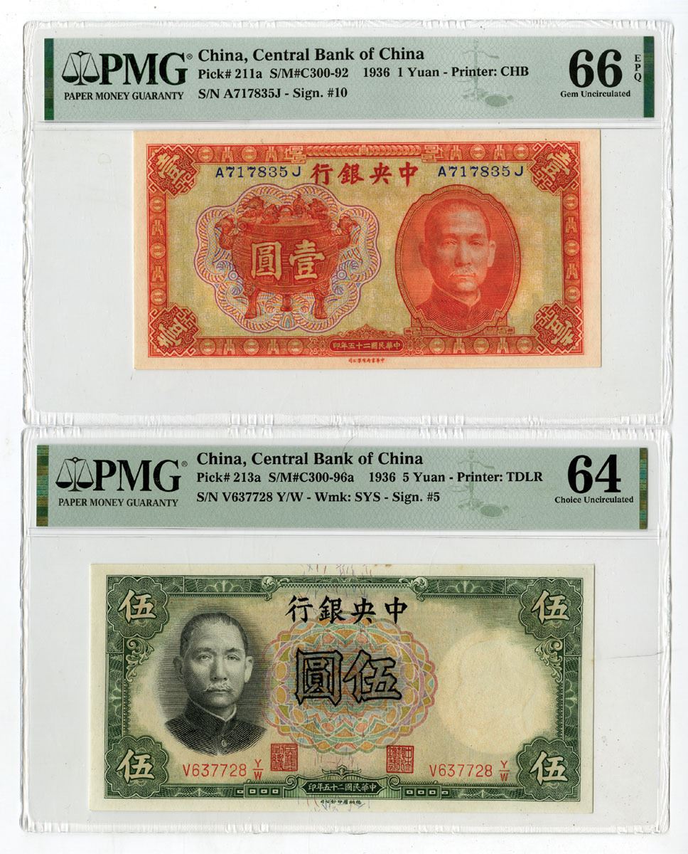 China, 1936. Lot of 2 Issued Banknotes, Includes: 1 Yuan, P-211a S/M#C300-92, Orange on m/c, S/N A717835J, PMG Gem Unc 66 EPQ, CHB; 5 Yuan, P-213a S/M#C300-96a, Green on m/c, S/N V637728 Y/W, PMG Choice Unc 64, TDLR. (2). Sold "AS IS" no returns accepted.