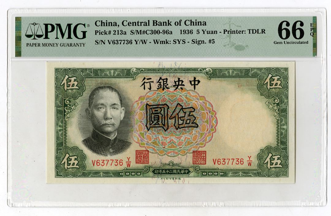 China, 1936. 5 Yuan, P-213a S/M#C300-96a, Issued Banknote, Green on tan and m/c underprint with SYS at left, Back is olive green with a forest at the center, S/N V637736 Y/W, PMG graded Gem Uncirculated 66 EPQ with comment "Radar Serial Number," Printer: TDLR.