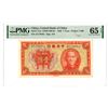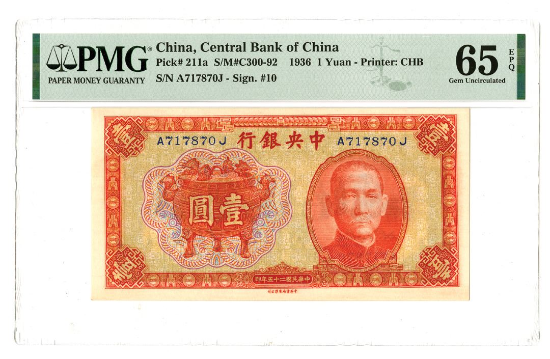 China, 1936. 1 Yuan, P-211a, S/M#C300-92, Issued Banknote, Orange and tan on m/c underprint with portrait of SYS at right, S/N A717870J Printer: CHB, PMG graded Gem Uncirculated 65 EPQ.