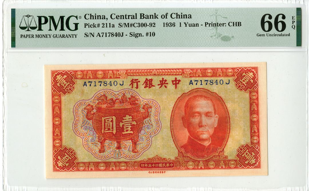China, 1936. 1 Yuan, P-211a, S/M#C300-92, Issued Banknote, Orange on m/c underprint with portrait of SYS at right, S.N A717840J Printer: CHB, PMG graded Gem Uncirculated 66 EPQ.