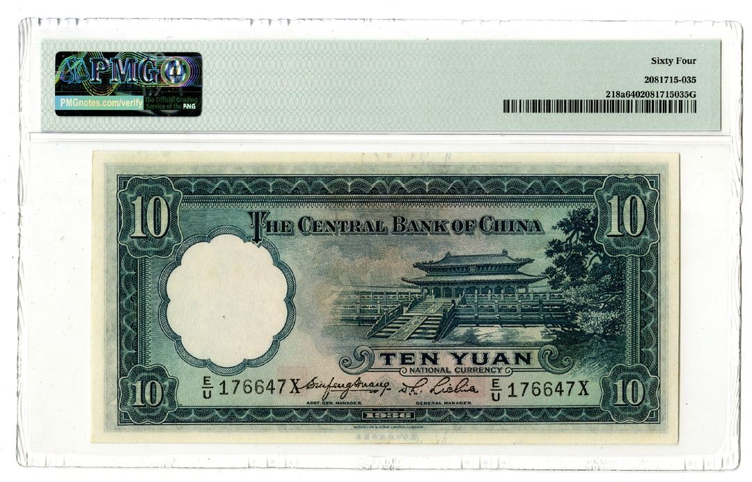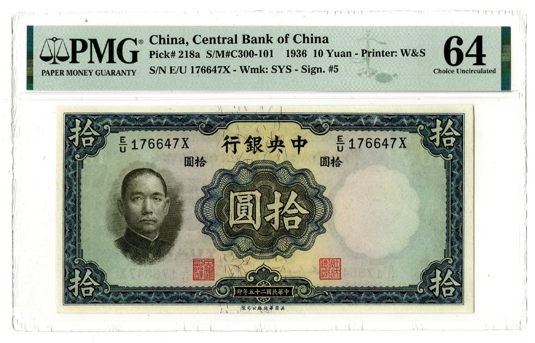 China, 1936. 10 Yuan, P-218a, Issued Banknote, Blue on m/c underprint with SYS at left, S/N E/U 176647X, Printer: W&S, PMG graded Choice Uncirculated 64.