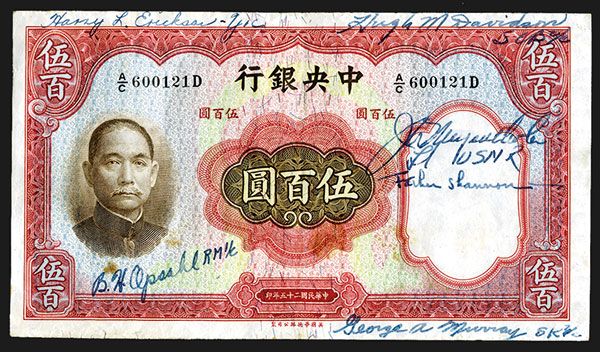 China, 500 Yuan, P-221a, signature 11, Issued banknote, red on m/c, front with SYS at left, back blue with Palace of China in Peking at right, This note was signed by a U.S. serviceman sometime in the past as a souvenir during WW II,, otherwise, the note would grade Choice VF to XF, Bright colors, large margins and sharp corners enhance this attractive note. W&S.