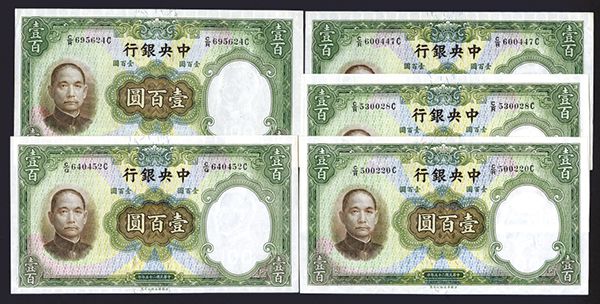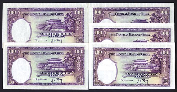 China, Lot of 5 notes, all are 1936, 100 Yuan, P-220a, issued banknotes, olive green and brown, SYS at left, back purple, Signature 11 in purple, 4 of the notes would grade CU to Gem Uncirculated and one AU due to a light corner fold, Extremely attractive group with bright colors, sharp corners, strong embossing and appear pack fresh. Rare to find these large sized notes in this very high condition. W&S.