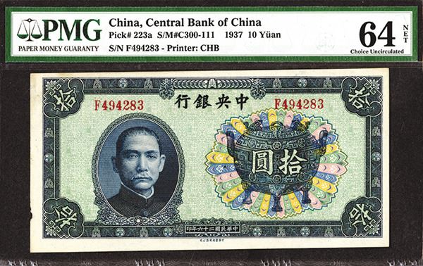 China. 10 Yuan. P-223a. S/M# C300-111. SYS at left end, incense burner at right. PMG graded Choice Uncirculated 64 NET, edge damage.