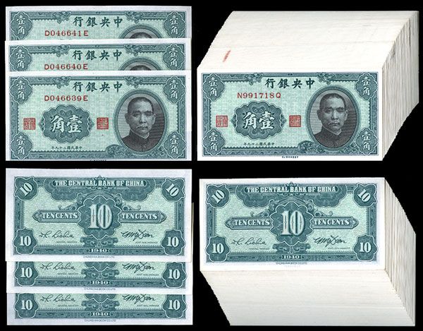 China, Lot of 84 notes, All are 10 cents= 1 Chiao, P-226, black and green, SYS at right, 81 are consecutive and the additional 3 are consecutive, Choice to Gem Uncirculated overall. CHB.