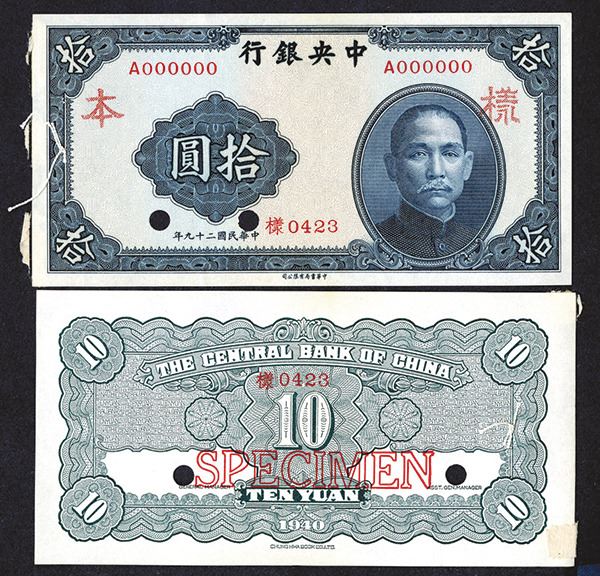 China, 10 Yuan, P-228s, Unlisted as a specimen, blue on m/c, SYS at right, back gray-green, Specimen Chinese Characters, POC, S/N A000000-0423, AU to Uncirculated with small pin holes on either the left or right margins and mounting remnants on the back borders, large even margins and fresh appearance. Chunghwa Book Co., Ltd.