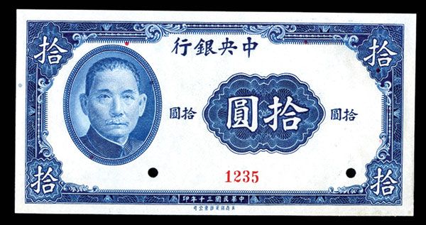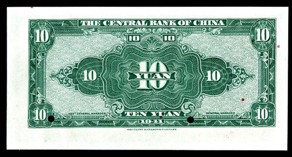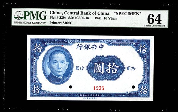 China, 10 Yuan, P-239s Unlisted Essay banknote. Missing the m/c undertints, seals and signatures. SYS at left, front blue, back green, Order # 1235 on bottom middle, 2 POC's, PMG graded Choice Uncirculated 64, very attractive and rare note in this format. SBNC. This is the finest known and highest graded out of 3 graded in the PMG census.