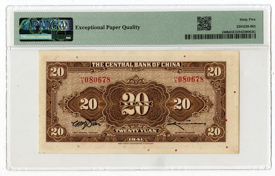 China, 1941. 20 Yuan, P-240b S/M#C300-163, Issued Banknote, Red on brown and m/c underprint with SYS at left, S/N H/I 080678, PMG graded Gem Uncirculated 65 EPQ, SBNC. Only 8 notes grade 1 increment higher out of 160 graded in the PMG census. Rarely seen this nice.