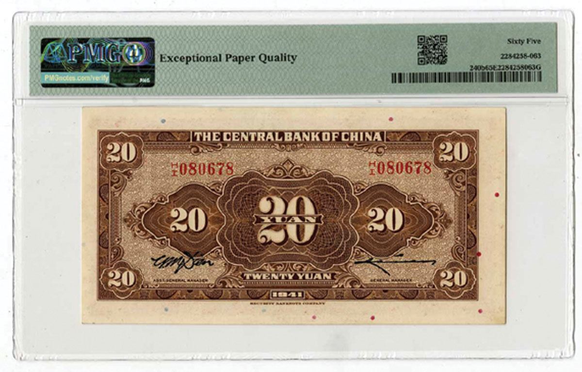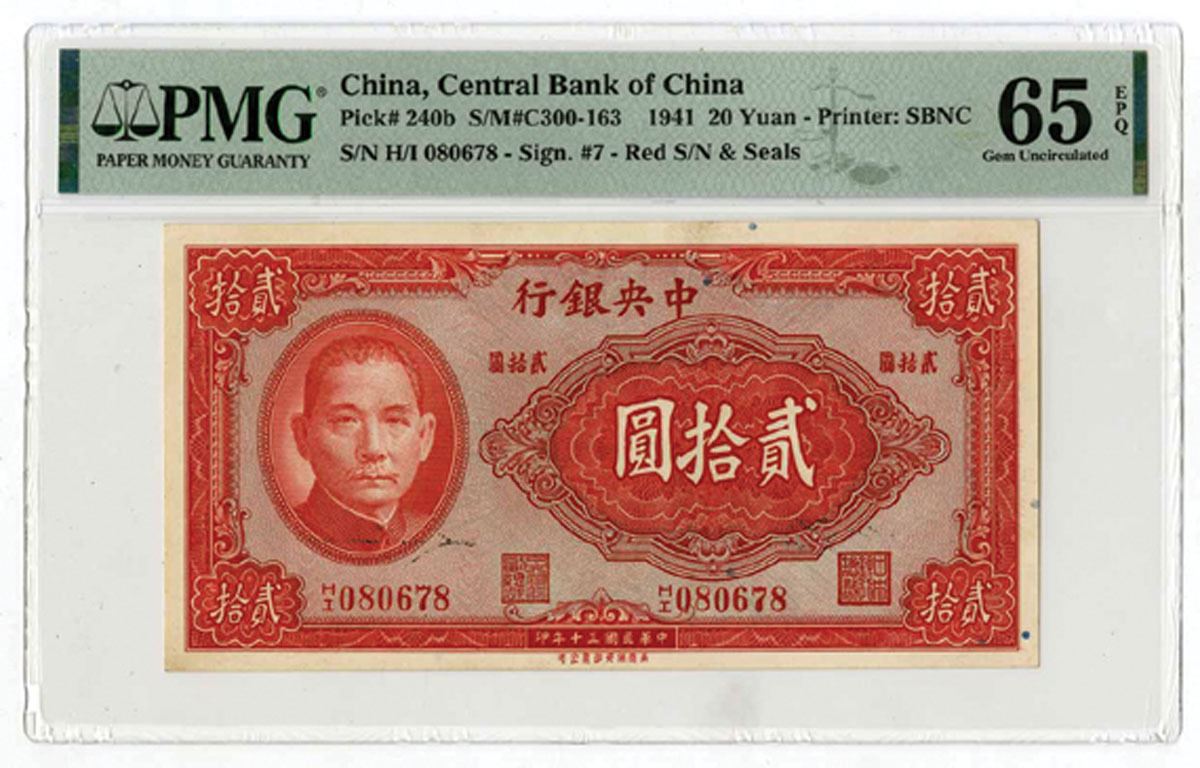 China, 1941. 20 Yuan, P-240b S/M#C300-163, Issued Banknote, Red on brown and m/c underprint with SYS at left, S/N H/I 080678, PMG graded Gem Uncirculated 65 EPQ, SBNC. Only 8 notes grade 1 increment higher out of 160 graded in the PMG census. Rarely seen this nice.