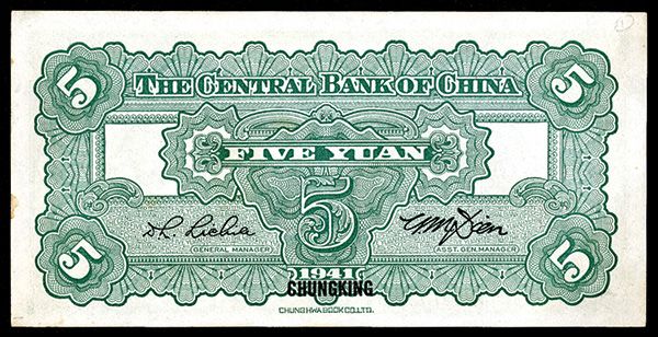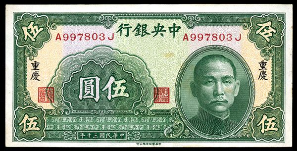 China. 5 Yuan "Chungking" Issue, P-234b, Uncirculated. A scarcer variety.