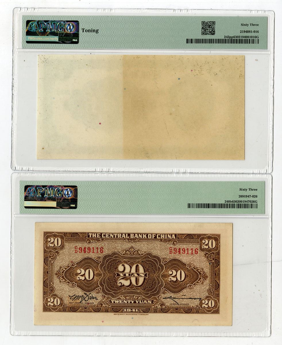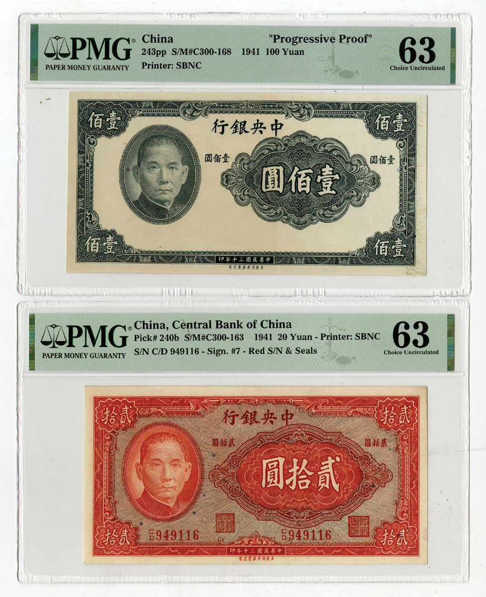 China, 1941. Lot of 2 Banknotes, Includes: 20 Yuan, P-240b S/M#C300-163, Issued Banknote, Red on gray and m/c underprint with SYS at left, S/N C/D 949116; 100 Yuan, P-243pp S/M#C300-168, Progressive Proof, Steel gray uniface note with SYS at left. Both notes are PMG graded Choice Uncirculated 63 but Proof has comment "Toning," and both printed by SBNC. (2). Sold "AS IS" no returns accepted.