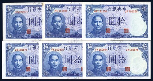 Lot of 6 notes, all are 10 Yuan, P-245c, issued notes, 3 with sequential serial numbers, all are Uncirculated to Gem Uncirculated. Attractive group, TDLR. From The Allen Berk Collection.