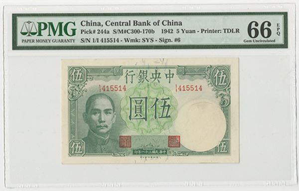 China. Issued 5 Yuan, 1942, P-244a, S/M#C300-170b. Radar S/N 415514. PMG graded Gem Unc 66 EPQ, highest graded for this type. TDLR.