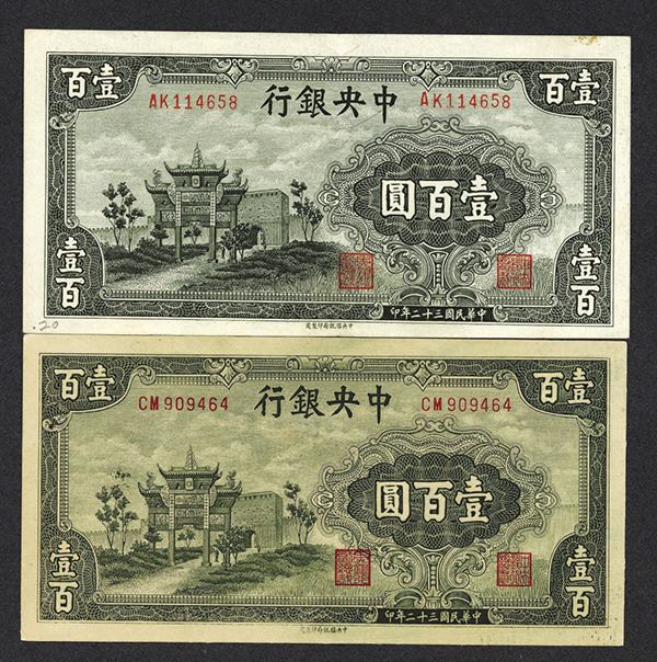 China. 100 Yuan. P-254. Victory Gate at left end. Value at center on back. Dark red or Light red serial # varieties. VF and Uncirculated. 2 pieces.
