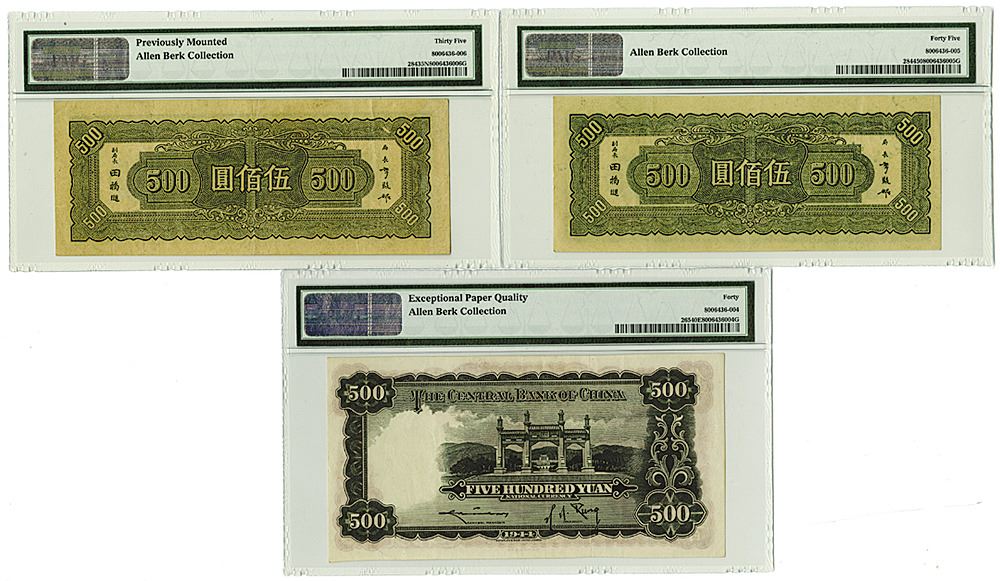 China. 1944-45, Lot of 3 notes, Includes 1944, 500 Yuan, P-265, 2 examples of 1945, 500 Yuan, P-284, PMG graded Choice VF35 NET and Choice XF 45. Attractive group of notes. (From the Allen Berk Collection)