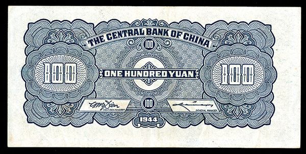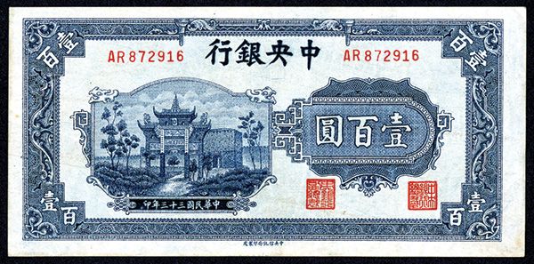 China, 100 Yuan, P-259, Issued banknote, Blue on light blue underprint, back blue, Choice AU-Unc. Chinese printer. Scarce note.