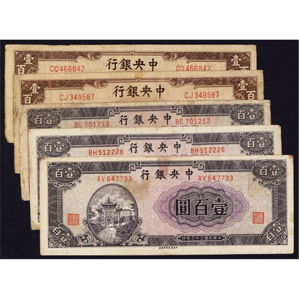China, 1944, Lot of 5 notes, Includes 3 examples of 100 Yuan, P-260, Issued, black on light gray and pale violet, P'ai-lou Gateway on left, Chinese Printer, Fine to VF; and, 2 examples of 100 Yuan, P-261, Issued, Brown, P'ai-lou Gateway in middle, both are Fine to VF condition. Scarcer Central Bank of China varieties.