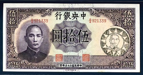 China, 50 Yuan, P-255 (S/M#C300-200) Issued banknote with hand stamp with circular rays with SYS image in middle on right overprinted in black, SYS portrait on left, back purple with “Commemorative Note - Not For Circulation” hand stamped on top and bottom excess margins, PMG graded Choice Uncirculated 63 NET with note of Stamped overprint of unknown origin. TDLR.