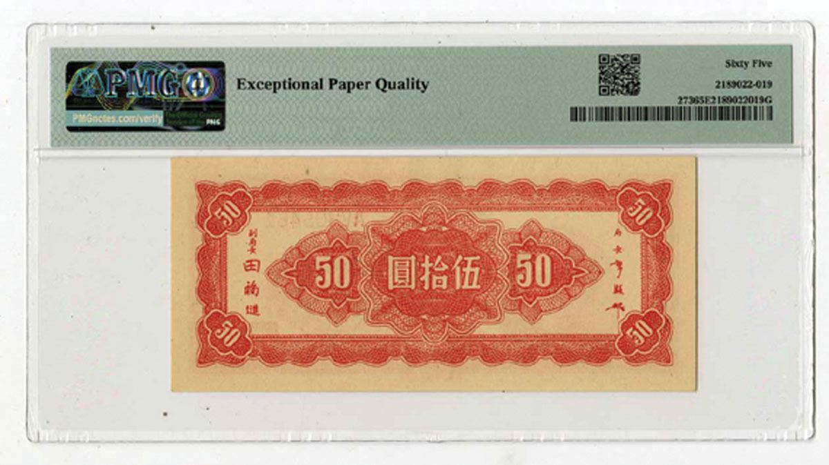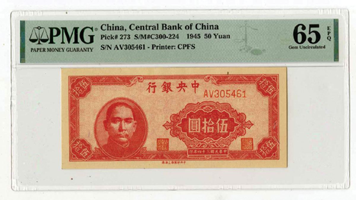 China, 1945. 50 Yuan, P-273 S/M#C300-224, Issued Banknote, Red on pale red underprint with Portrait of SYS at left, Back is red, S/N AV305461, PMG graded Gem Uncirculated 65 EPQ, CPFS.