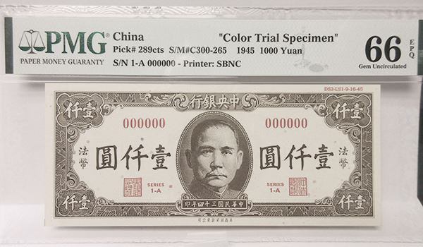 China, 1945, 1000 Yuan, P-289cts S/M#C300-265, Specimen banknote, Dark brown on m/c, S/N 00000, Ser. 1-A, Upper right corner has small red letters " DS3-LS1-9-16-(19)45, PMG graded Gem Uncirculated 66 EPQ, Rare note in high grade and extremely rare as color trial, SBNC.